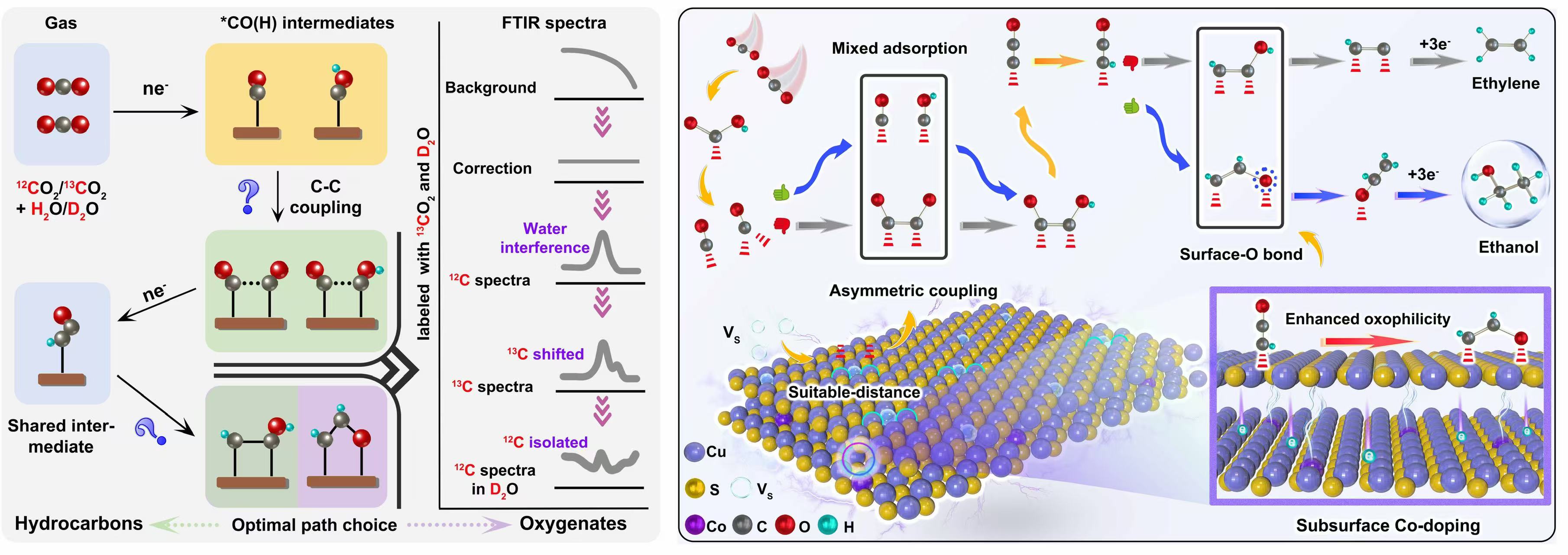 目前,碳-碳耦合缓慢的动力学及一系列选择性决定中间体的分岔路径,是二氧化碳定向选择性还原制乙醇的关键障碍。该研究报道了一种新型催化剂——次表面钴掺杂硫化铜(Co-Sub-CuS),通过表面-次表面电子相互作用,精确调控分支路径中氧结合中间体*CHCHO的吸附构型选择性导向乙醇路径。同时,次表面钴掺杂调控表面双Cu位点间的最优距离,促进碳-碳不对称耦合及整体C2产物的高选择性。封装的膜电极组装电解池中,催化剂在550.9 mA cm-2的分电流密度下实现了78.7%的乙醇法拉第效率,并在700 mA cm-2的工业级电流密度下保持305小时以上的卓越稳定性。该工作展示了利用氧结合中间体对分支路径定向调控的概念,为基础研究和CO2电还原燃料转化的应用领域提供了宝贵见解。