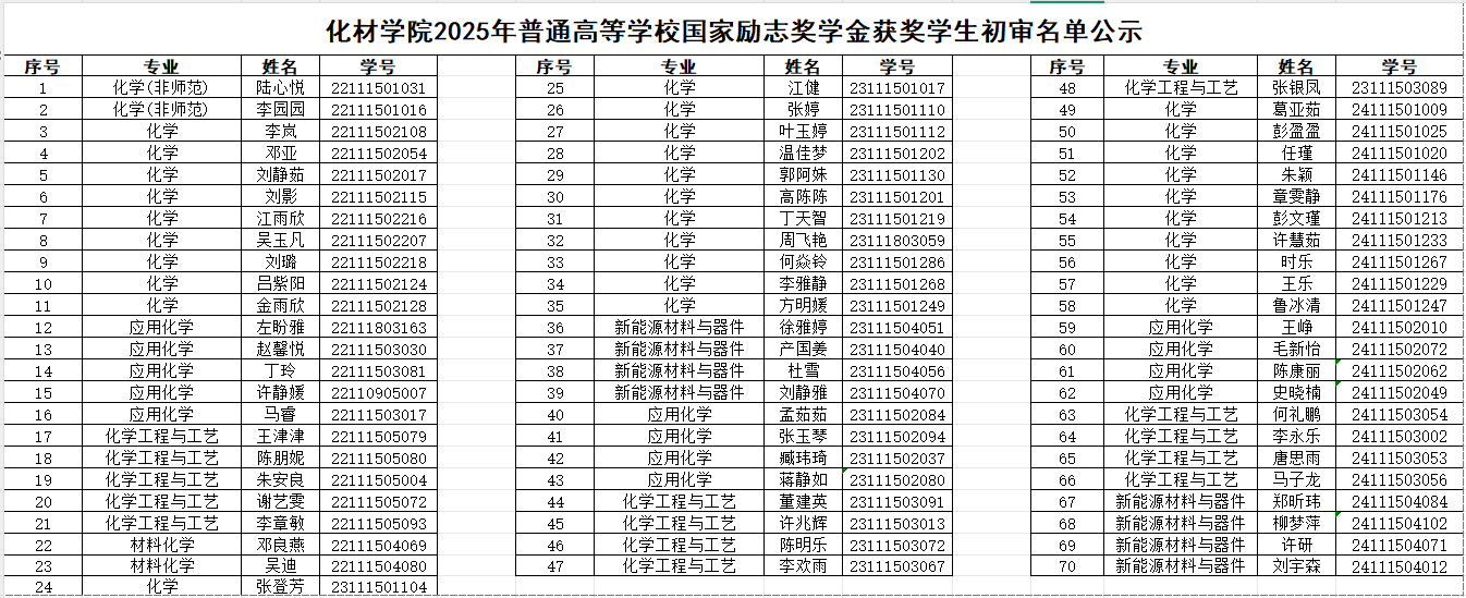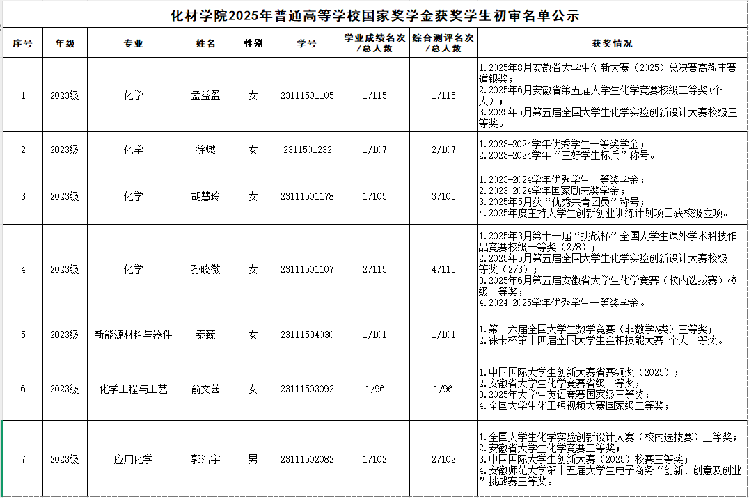 根据《安徽师范大学国家奖学金评审办法(修订)》 《安徽师范大学国家励志奖学金评审办法(修订)》文件精神,按照《关于做好我校本科生2025年国家奖助学金评审推荐工作的通知》要求,经评议,现将化材学院2025年国家奖学金、国家励志奖学金获奖名单予以公示。