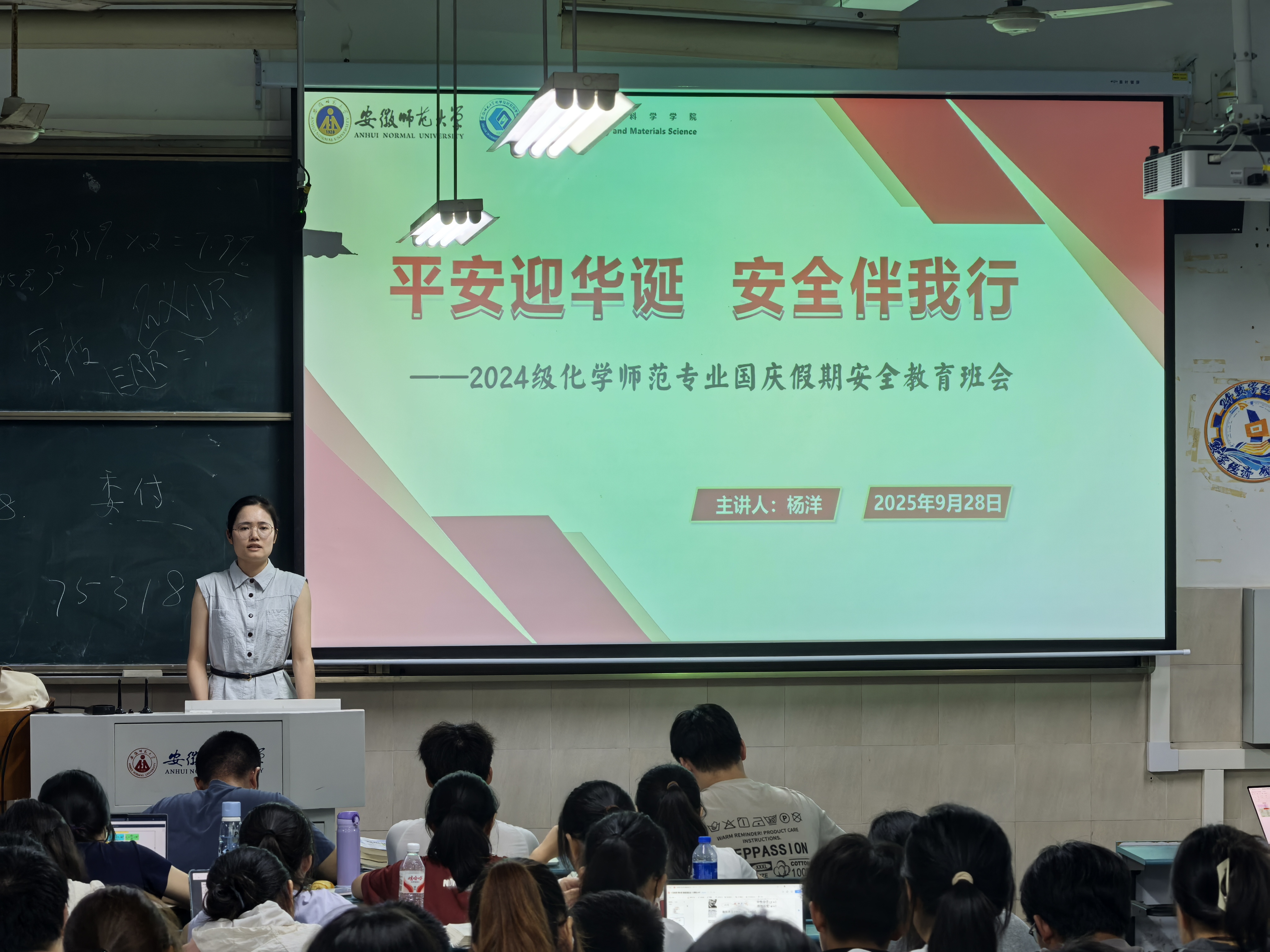 为切实保障学生的假期安全,增强学生安全防范意识和自我保护能力,9月28日,化材学院2024级化学师范专业召开国庆假期安全教育主题班会,此次班会由杨洋老师主持,全体学生参会。