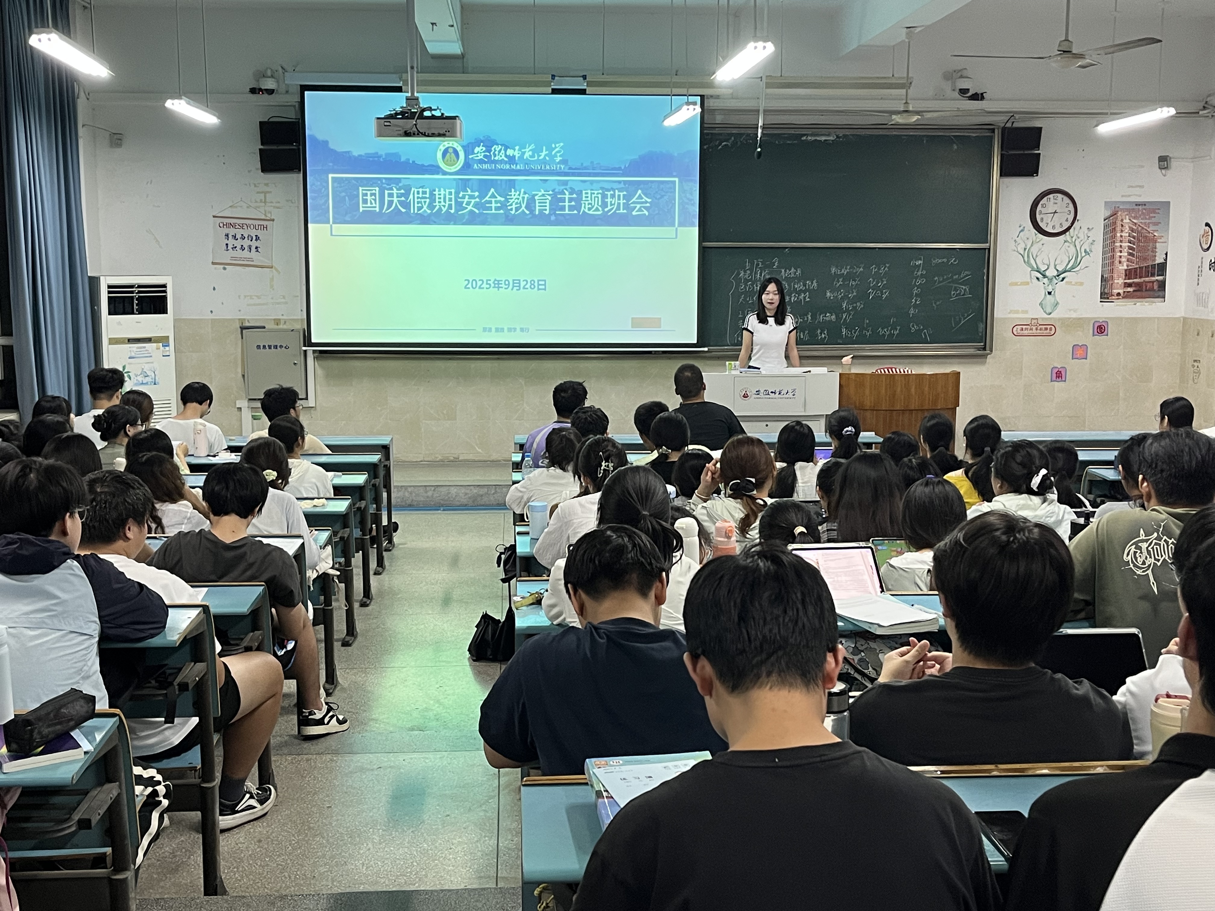会议伊始,王霞老师结合大学生出行频繁、社交广泛、网络活动活跃等特点,聚焦假期高频安全风险,开展针对性教育,就学生国庆期间离校及旅行的安全问题做出强调。离校期间,宿舍需注意断水断电、锁好门窗,保持环境干净整洁,拒绝使用违规电器,防止寝室出现火灾。日常出行方面,同学们要注意遵守交通规则,保管好随身财物。离校出市时要严格履行请销假制度,严禁擅自离校、晚归不归,在校的同学也要严格遵守学校的规章制度。
