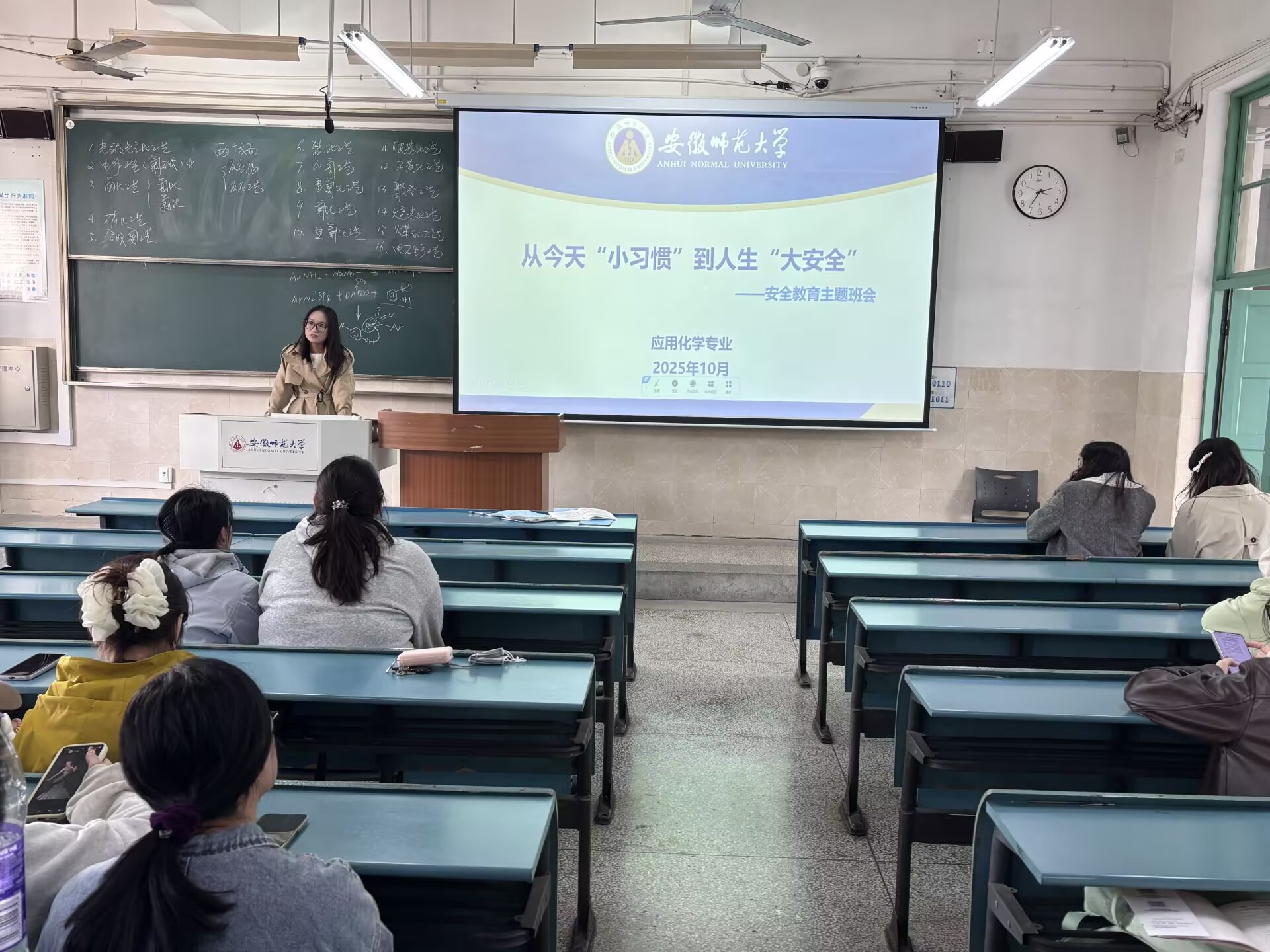本网讯(化材学院 赵军)为进一步增强学生的安全意识,普及安全知识,有效防范各类安全事故发生,切实保障学生的人身财产安全,维护和谐稳定的校园环境,化材学院辅导员朱文棋于2025年10月29日下午组织召开2022级应用化学专业全体学生安全教育主题班会。