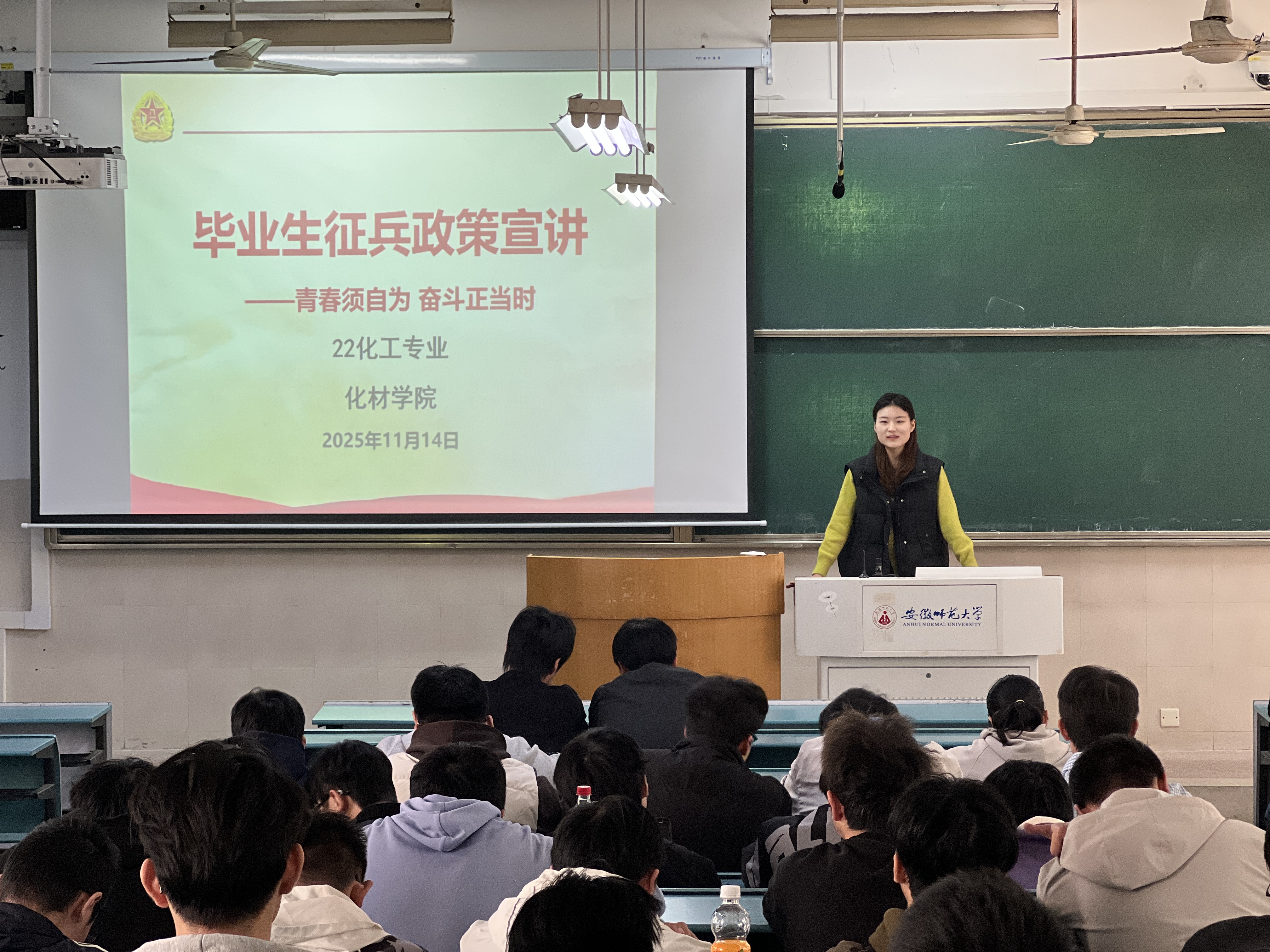 逐梦军营践初心,青春报国正当时,2025年11月14日化学与材料科学学院化学工程与工艺专业在2030201由辅导员朱老师组织开展毕业生征兵主题教育。班会为深入贯彻落实国家征兵工作政策,鼓励引导应届毕业生响应祖国号召、投身国防事业。