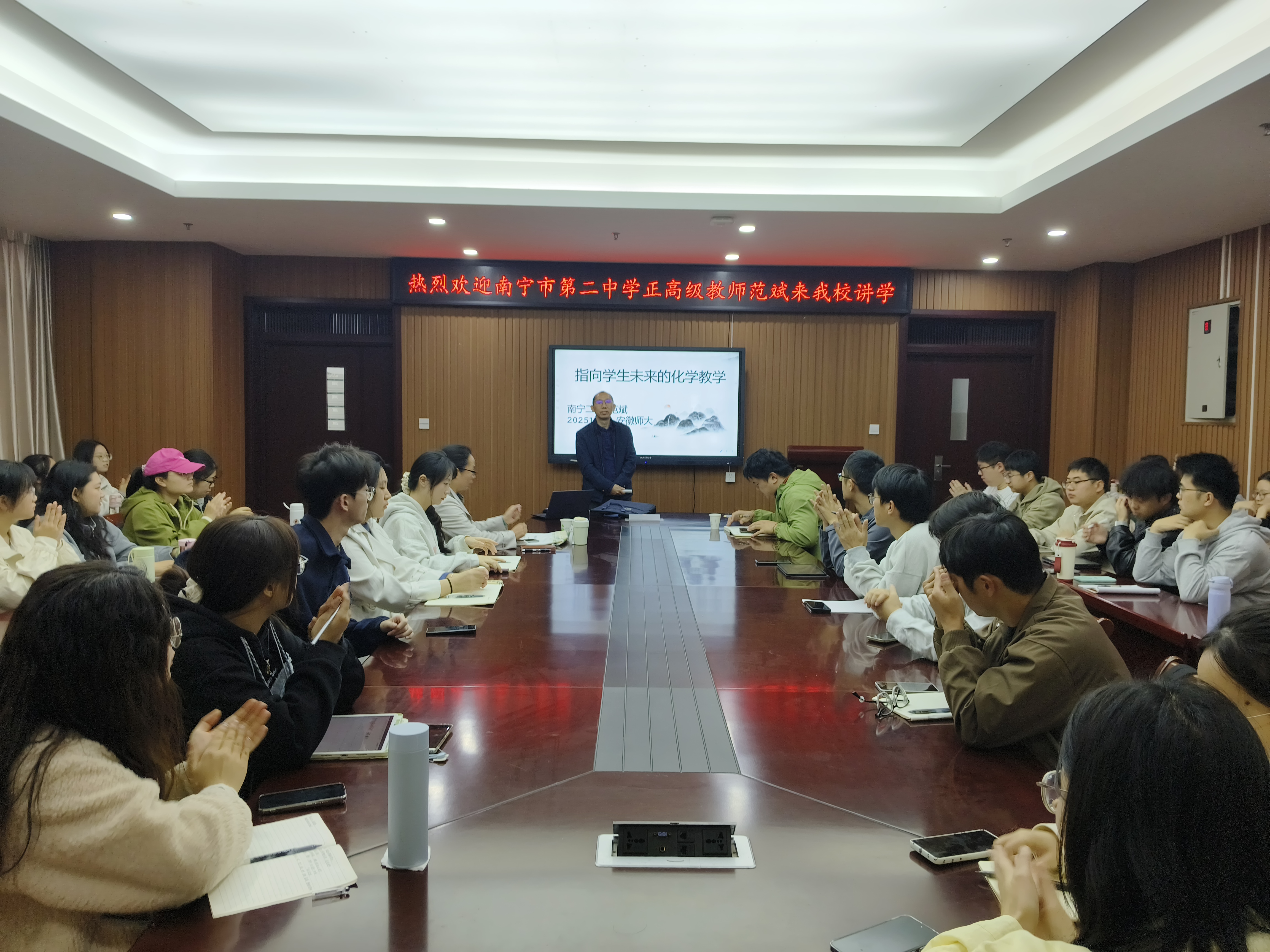 (图/文 陈哲群 李佳怡)10月27日,南宁市第二中学正高级教师范斌应邀来我校讲学,报告会在花津校区礼勤楼702会议室举行,由化材学院孙影教授主持,化学教学论教师、化学教育专业研究生共同参加。