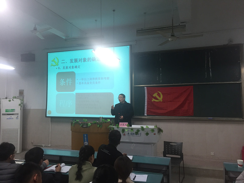 本网讯(党课班 王思源)12月1日晚19:00,化材学院第23期入党积极分子培训班第四次培训在行知楼2020403教室举行,化材学院党委书记汪俊武老师应邀给学员们作“组织入党和思想入党”的专题培训,培训由王雨兵老师主持。