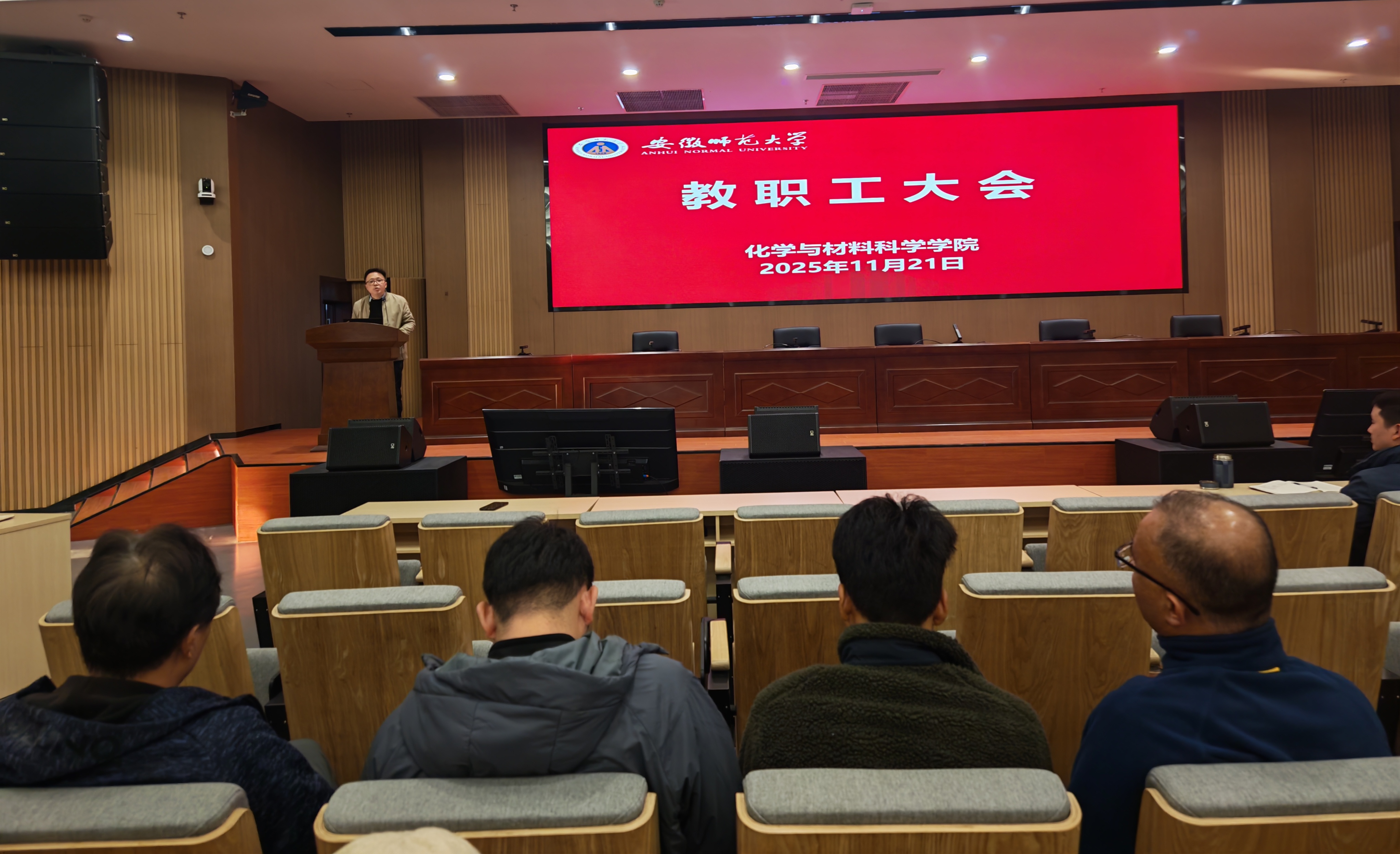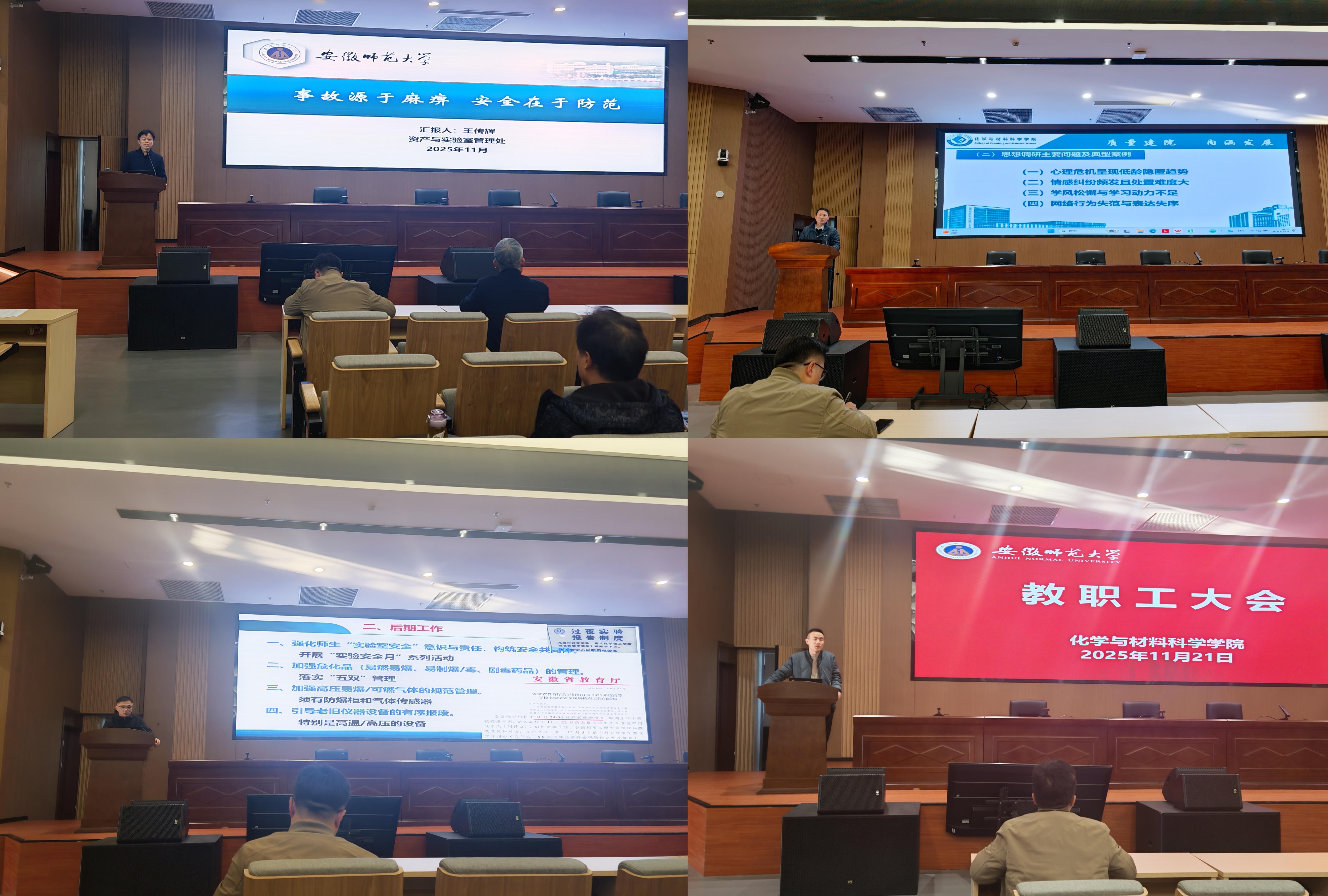 11月21日下午,化材学院在文典楼西(侧)裙3楼报告厅召开全体教职工大会,集中传达学习党的二十届四中全会精神,开展实验室安全和师德师风专题教育,全体教职工参加会议,院党委书记梁齐军主持会议。