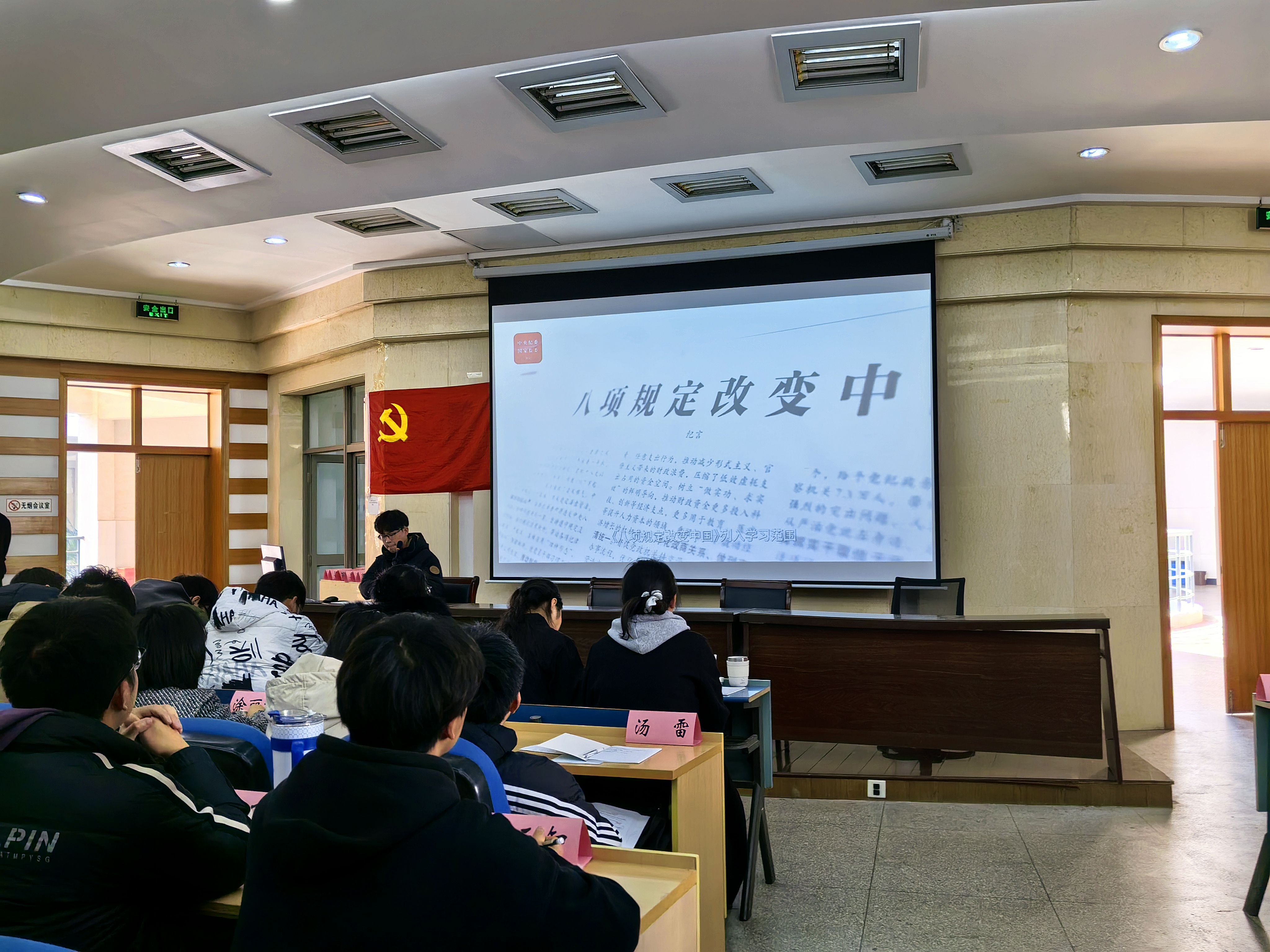 在视频教学环节,学员们集中观看了《八项规定改变中国》与《奋进新时代》两部专题片。通过生动的影像资料,学员们深刻认识到中央八项规定作为新时代作风建设的标志性举措,不断推动党风政风持续向好、社风民风焕然一新;从《奋进新时代》展现的新时代十年历史性成就、历史性变革中,进一步增强了民族自豪感与历史责任感。大家纷纷表示,在今后的学习生活中严格要求自己,把学习感悟转化为立足本职、担当作为的实际行动,发挥先锋模范作用,助力校园优良风气建设。