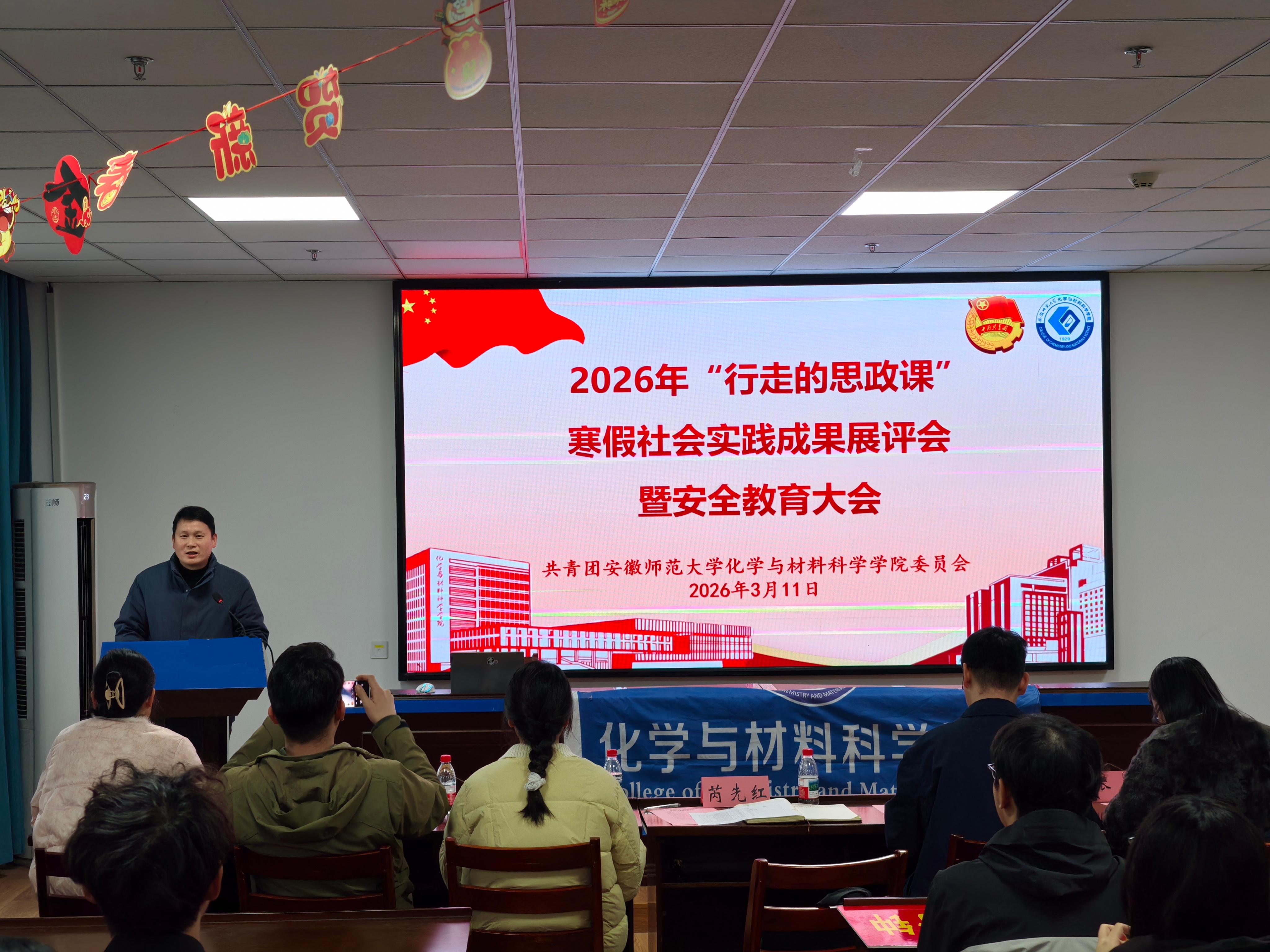为全面呈现“行走的思政课”寒假社会实践成果,进一步厚植青年学子的家国情怀与责任担当,锤炼实干担当与服务社会的过硬本领,筑牢学生安全意识,3月11日,化材学院于文典楼C108会议室召开寒假社会实践成果展评暨安全教育大会,化材学院党委副书记芮先红、院团委书记王霞、院团委副书记梁成,全体专兼职辅导员,2024级、2025级各班学生代表以及学院团委、学生会成员参会。本次会议由2025级化学(师范)专业堵梓叶主持。