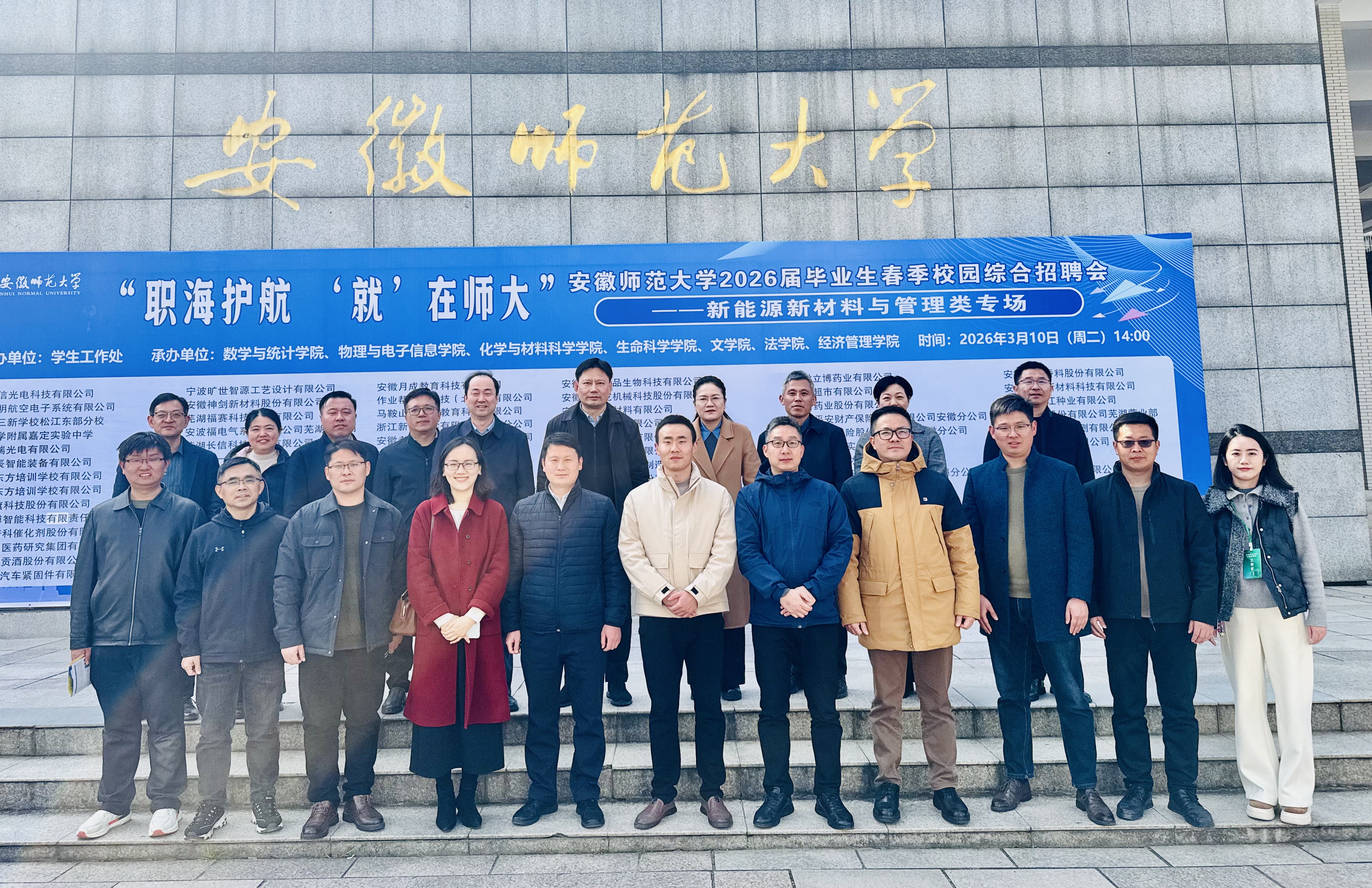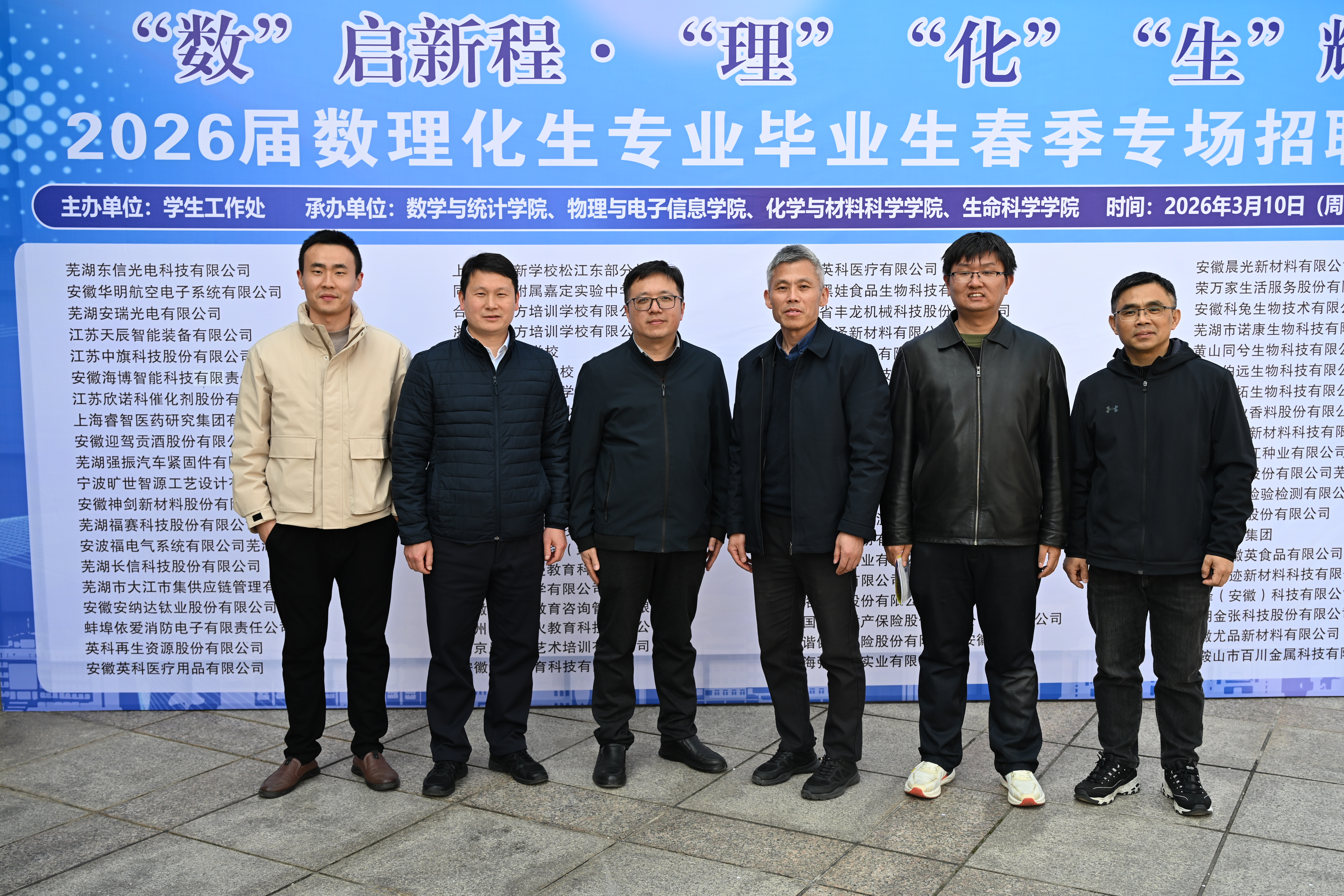 3月10日下午,化学与材料科学学院联合数学与统计学院、物理与电子信息学院、生命科学学院,在学生工作处指导下,于花津校区大学生活动中心二楼就业招聘大厅成功举办“‘数’启新航·‘理’‘化’‘生’辉”——2026届毕业生春季专场招聘会。副校长王刚、学生处处长乔静等领导亲临现场指导,详细了解用人单位招聘需求及毕业生求职情况,对招聘会的组织筹备工作给予充分肯定。