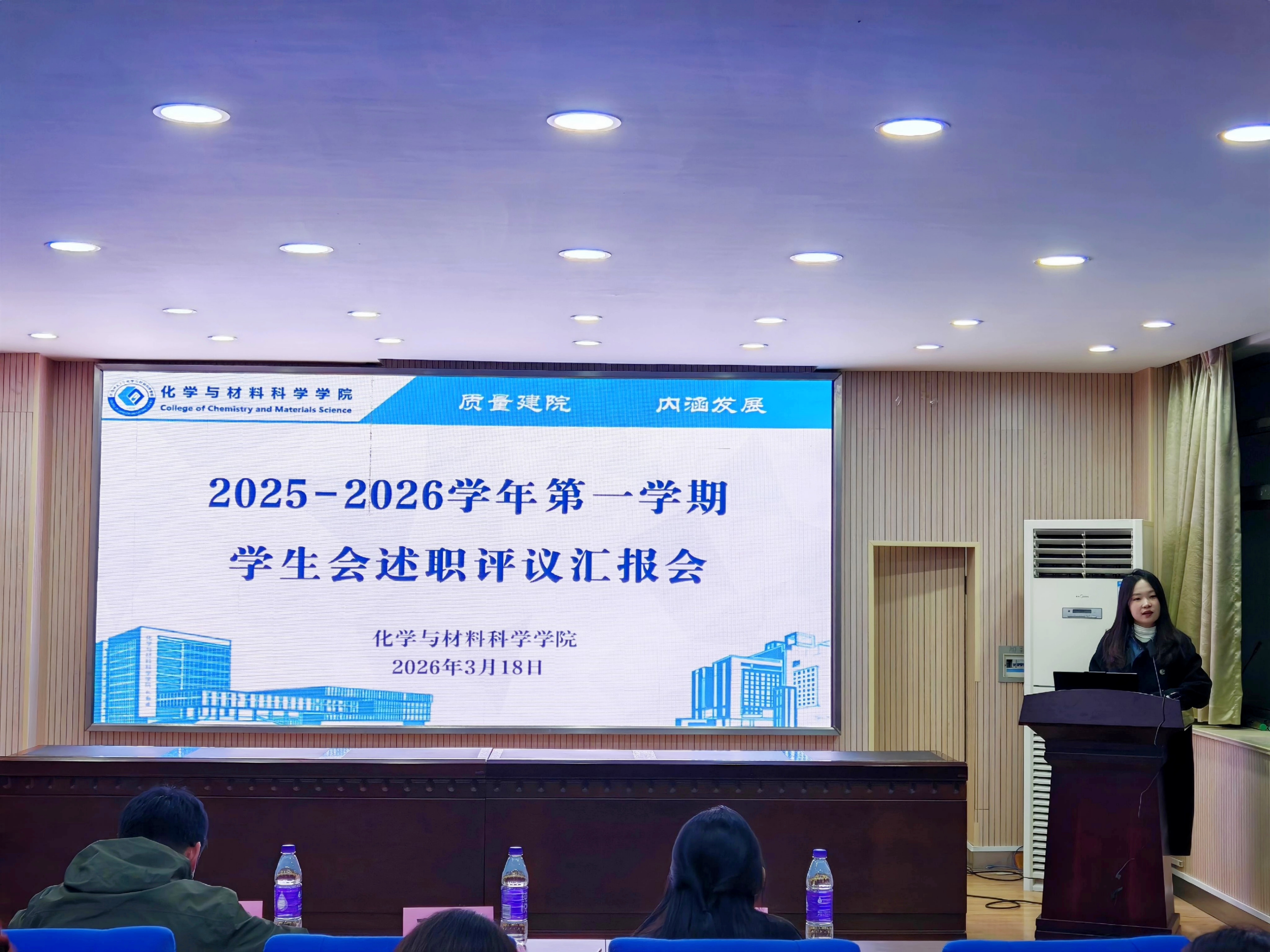 为全面总结上学期学院学生会工作成果,查摆工作不足,进一步规范学院学生工作开展,提升育人实效,推动学生会工作提质增效,3月18日晚,化材学院于学苑南楼6号楼216会议室召开2025-2026学年第一学期学生会述职评议汇报会。学院团委书记王霞、团委副书记梁成,校学生会主席团成员张立云出席本次会议。院学生会主席团成员、各部门部长及团委、学生会全体成员参与本次会议。本次会议由2025级化学(师范)专业郭佳怡主持。