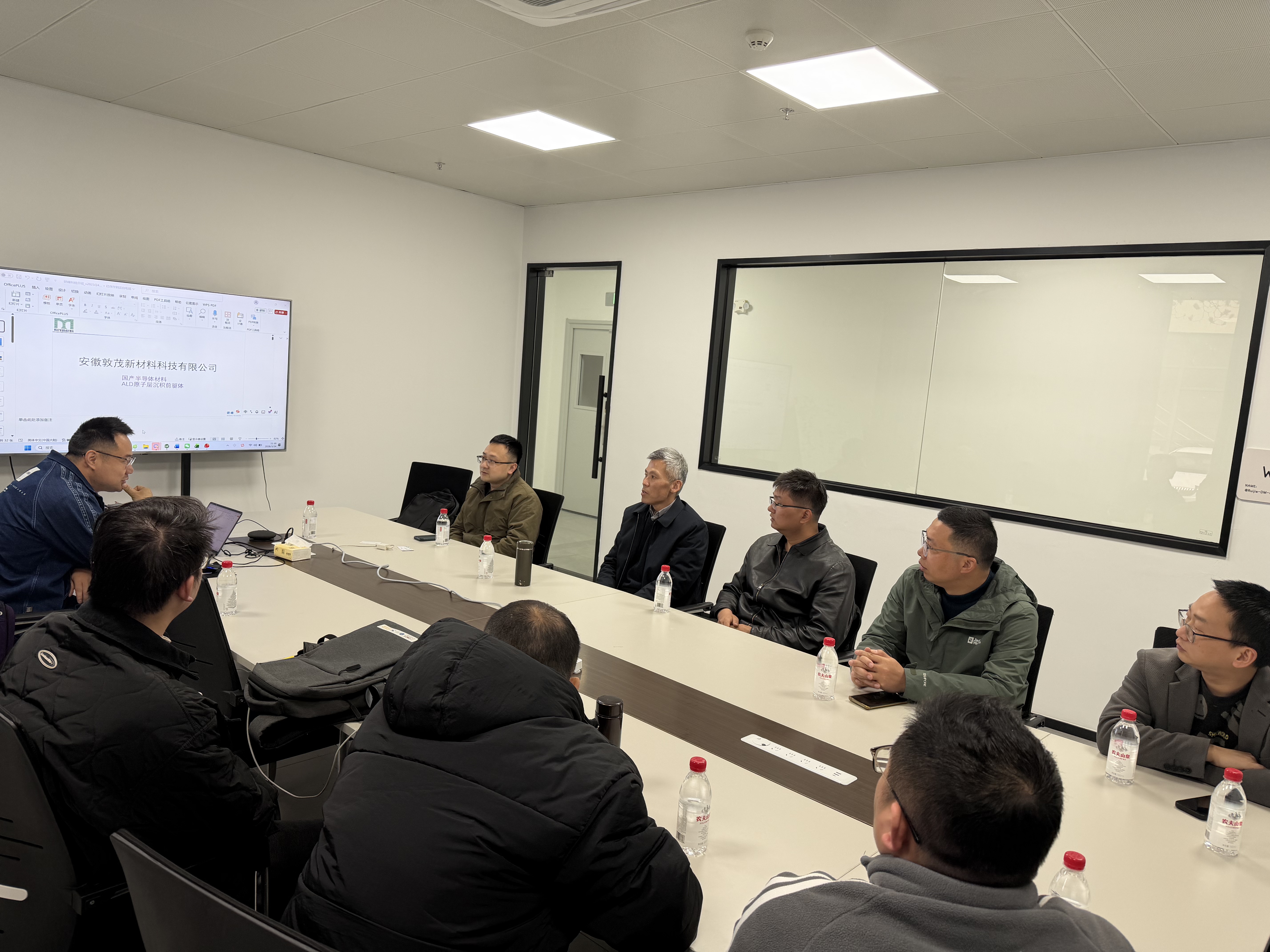 梁齐军一行首先来到安徽敦茂新材料科技有限公司,企业负责人曾超陪同参观了解企业生产展厅和研发中心,介绍了公司发展、产业布局、技术优势及人才需求,调研组深入了企业生产工艺、岗位场景及技能要求,双方就人才培养、学科建设、及毕业生就业、实习就业基地建设等进行深入交流。