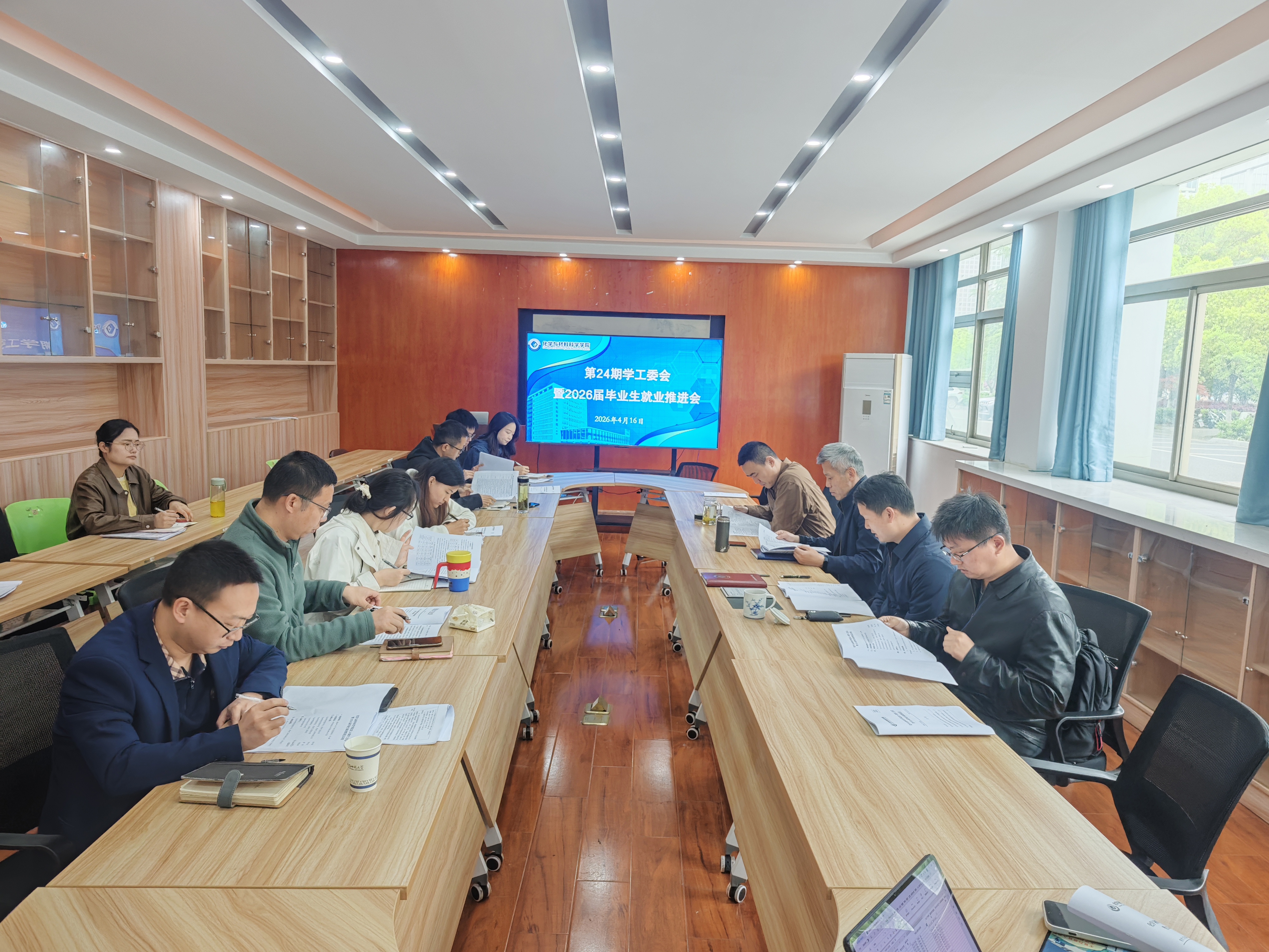 4月16日上午,化学与材料科学学院在花津校区学苑南楼6号楼106会议室召开第24期学生工作委员会暨2026届毕业生就业推进会,紧扣春季促就业攻坚行动要求,对毕业生就业工作再部署、再推进、再落实。学院党委书记、院学工委主任梁齐军,院党委副书记、院学工委常务副主任芮先红,副院长陈郑、代胜瑜,各系主任及全体专兼职辅导员参会,会议由芮先红主持。